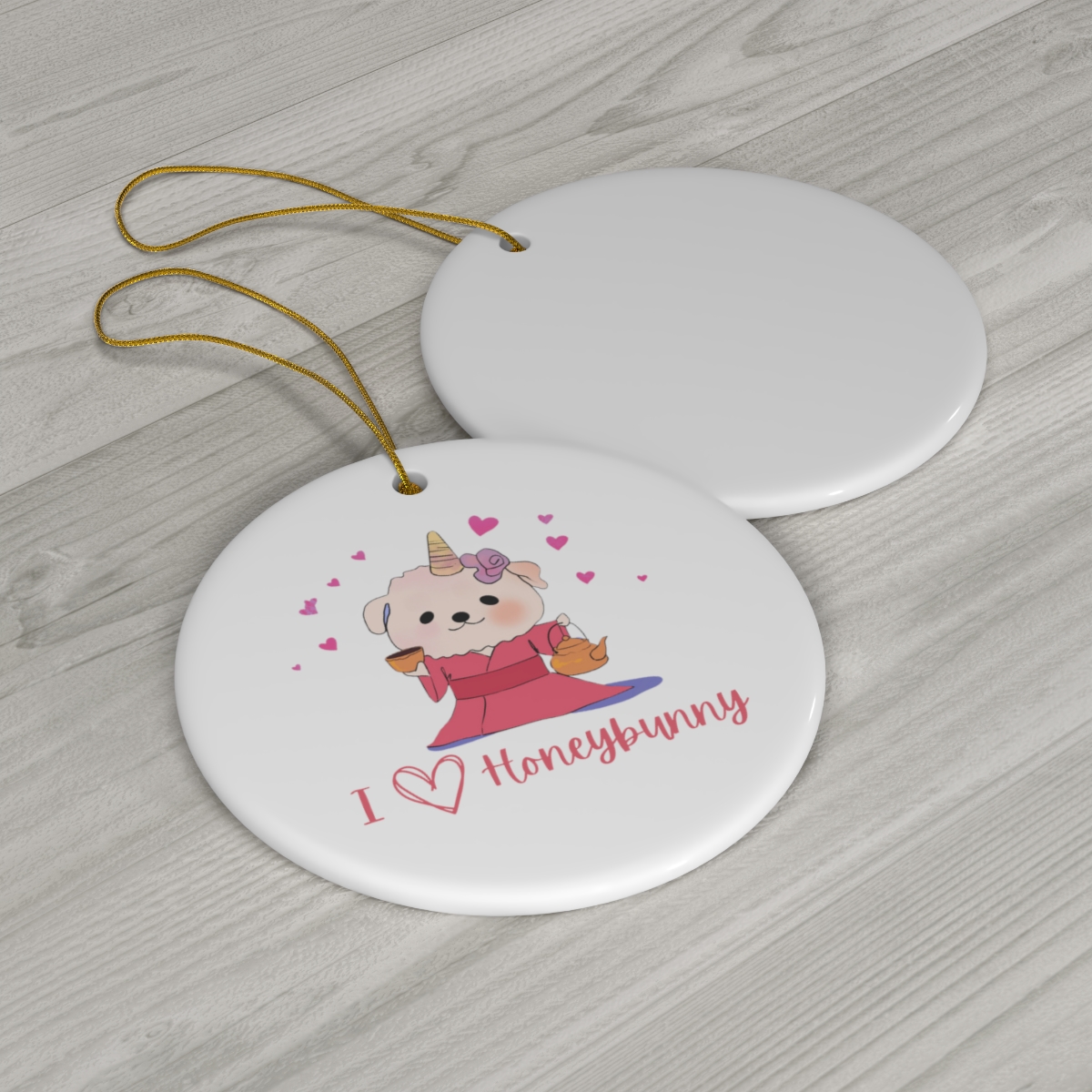 Show your holiday spirit and your love for Honeybunny with this adorable ceramic ornament. This custom-made Christmas ornament can be the perfect heirloom to use year after year, generation after generation.